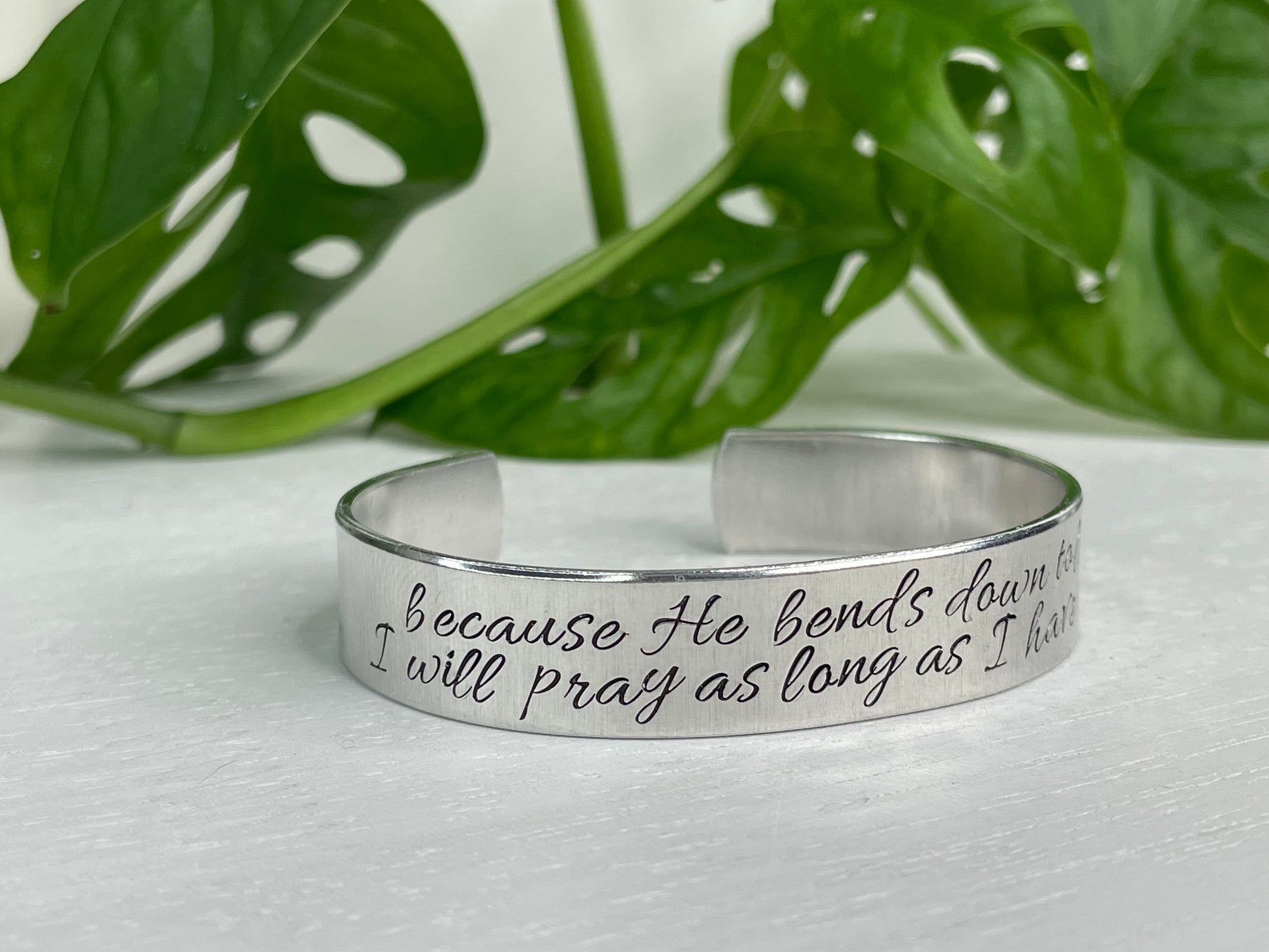 All of our items are hand stamped one letter at a time. Because of this, the piece you receive may differ slightly from the picture. This is the nature of hand stamping and adds to the beauty and uniqueness of each piece.