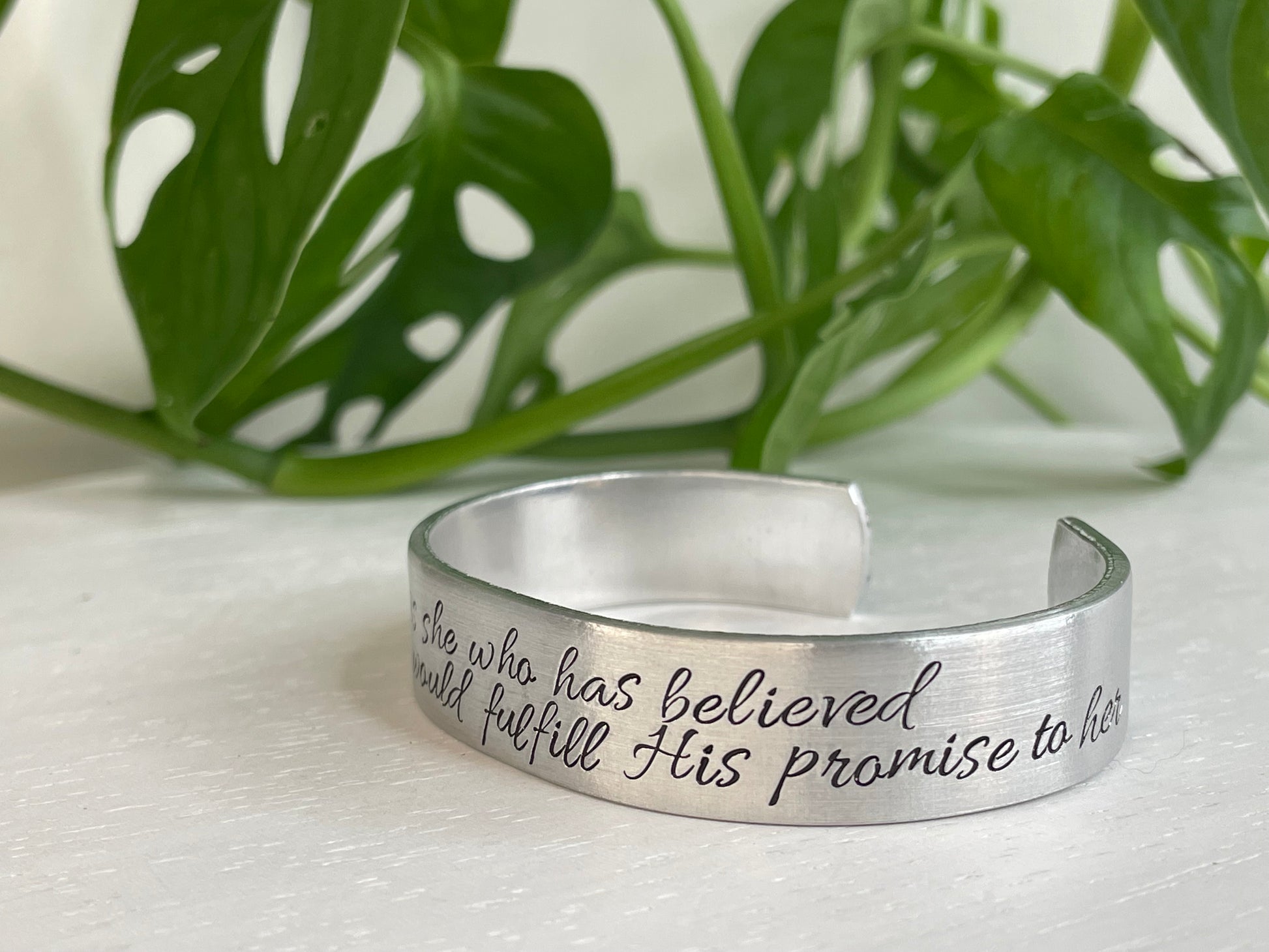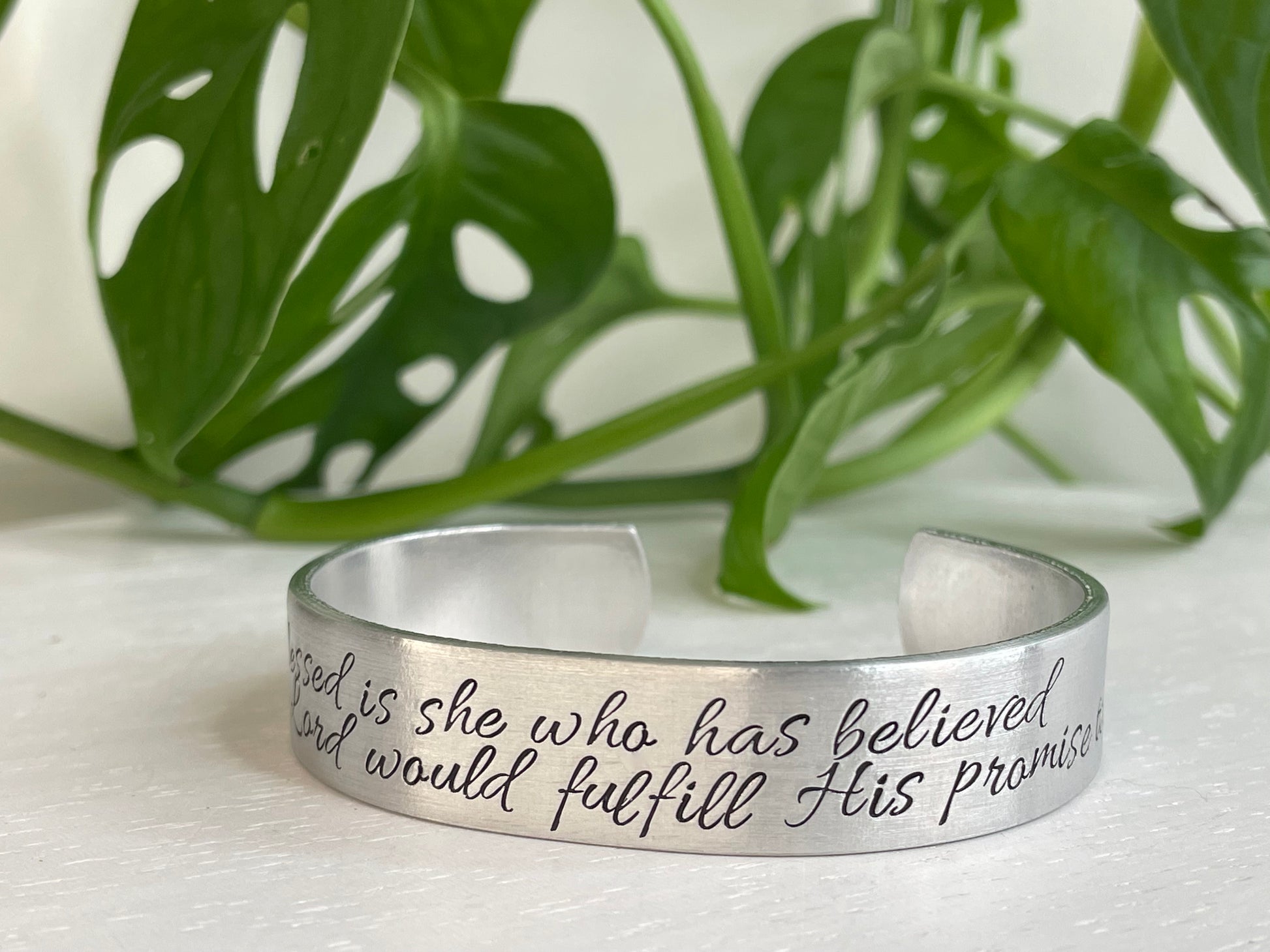 All of our items are hand stamped one letter at a time. Because of this, the piece you receive may differ slightly from the picture. This is the nature of hand stamping and adds to the beauty and uniqueness of each piece.