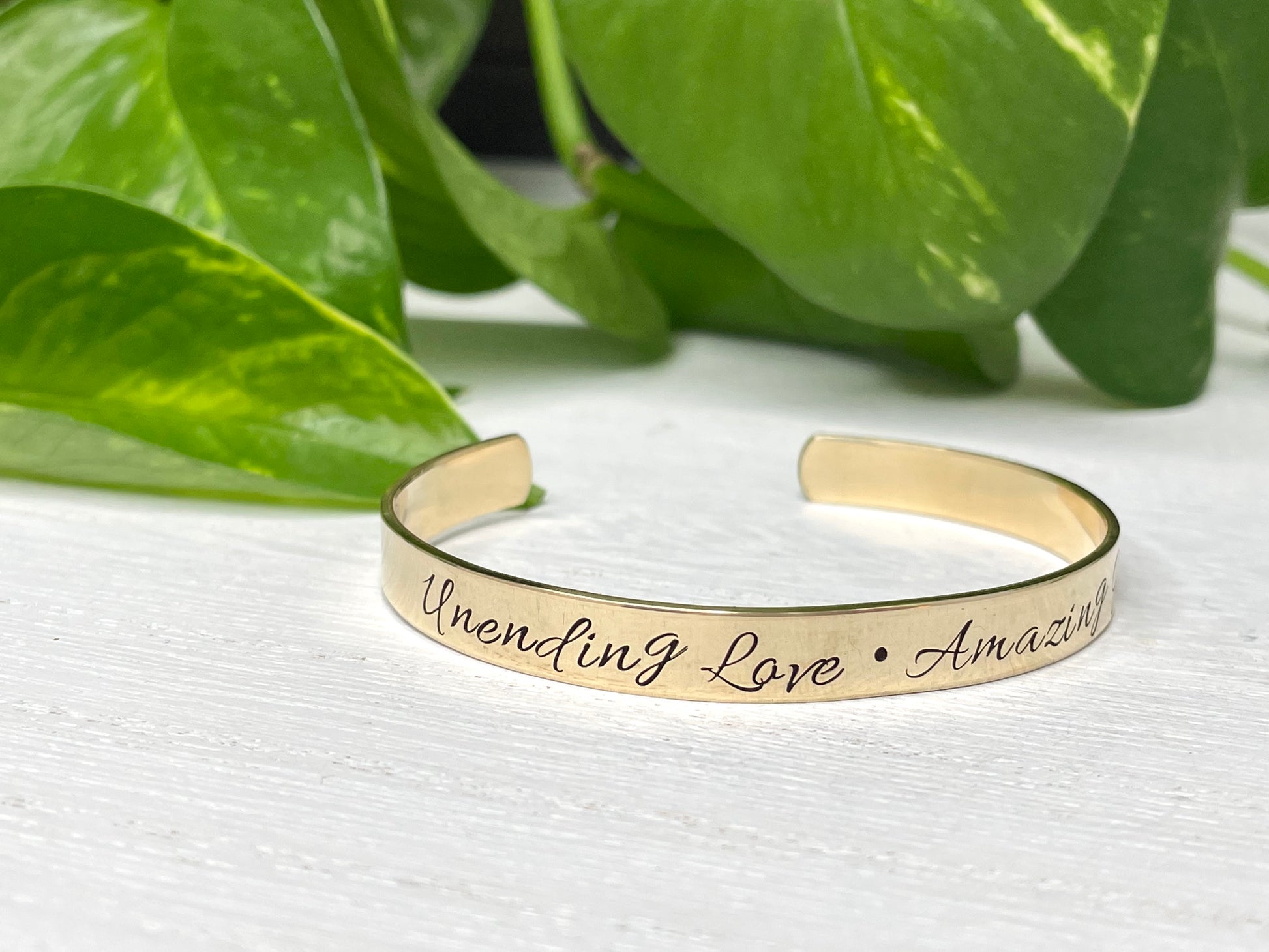 All of our items are hand stamped one letter at a time. Because of this, the piece you receive may differ slightly from the picture. This is the nature of hand stamping and adds to the beauty and uniqueness of each piece.